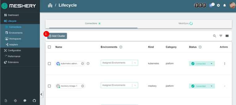 Examples of connections managed by Meshery include GitHub integrations, Prometheus connections, Kubernetes clusters, and more. It's essential to assign these connections to an environment and link that environment to your selected workspace.